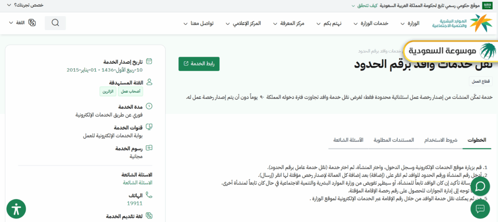 يمكن الذهاب إلى خدمة نقل خدمات وافد برقم الحدود في السعودية على موقع وزارة الموارد البشرية عبر الرابط hrsd.gov.sa مباشرة لاستعراض التفاصيل ثم بدء تسجيل الدخول والاستفادة من الخدمة.